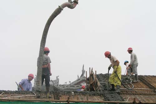 近日,位于繁華的槐古路上的無錫朝陽茶葉市場工地一片繁忙,施工人員正加緊建設。圖為新建建筑開始灌注屋頂。