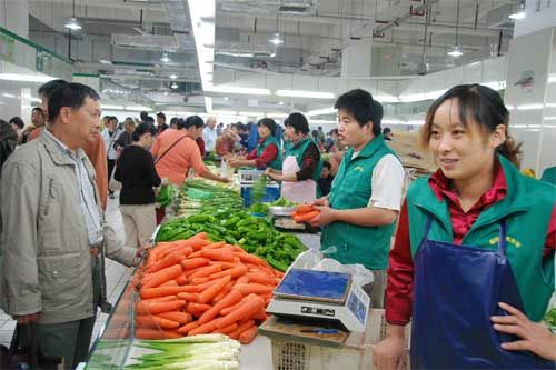 一大早,來自全市四面八方的市民云集這里,一樓蔬菜區人頭攢動,嫩綠的葉菜和鮮紅的果菜賞心悅目??缟献詣臃鎏荩灰姸侨忸惛笔称穮^布局整齊,一排排嶄新的計價電子秤輕快地吐出銷售票據,從此,消費者在農貿市場購物也可以得到銷售憑證了。