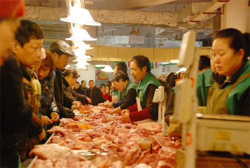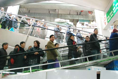 早上7點(diǎn)開始,一直到下午18點(diǎn),槐古支路上,市場門口早已排滿各種非機(jī)動車輛,市場一樓的蔬菜區(qū)用寸步難行來形容并不過分,各個攤位前擠滿了買菜的人群。無錫市民過節(jié)必備的如意菜--黃豆芽攤位前,以及肉類加工區(qū)、家禽屠宰區(qū)更是排起了長龍。這也是朝陽農(nóng)貿(mào)市場新樓開業(yè)后所出來沒有過的熱鬧。