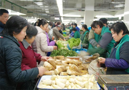 “大白菜0.4元/斤,蘿卜0.5元/斤,花菜1.3元/斤”,在朝陽農(nóng)貿(mào)市場一樓賣蔬菜的王老板,一天銷量在5000斤左右。提起價格,王老板反映比去年同期便宜,像大白菜去年要賣到1元/斤。冬筍只賣8元/斤,而去年賣到12-13元/斤。經(jīng)營戶表示,今年是冬筍產(chǎn)量的大年,貨源多,春節(jié)前漲幅不大。