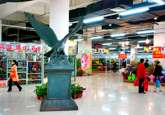 這尊雕塑以展翅的雄鷹為造型,落地3米多高,展翅寬幅達2米,精雕細刻,技藝精湛,栩栩如生,寓意深刻。雄鷹是中華民族的圖騰之一,有著深厚的文化內涵,蘊含著勇于開拓,不斷進取之精神。鷹的兩翼振翅作飛,呈“V”型,取英文“VICTORY”,即為“勝利”之意,表達了朝陽集團實現(xiàn)多方共贏局面的目標和信心。鷹也是世界上最長壽的鳥類,源于它有著破羽再生的能力,寓示著自我改革、浴火重生的勇氣和決心。“展翅雄鷹”陳列在文化工藝品市場,迅即成為市場亮點,受到市場經營戶和顧客的廣泛好評,成為市場的鎮(zhèn)館之寶。