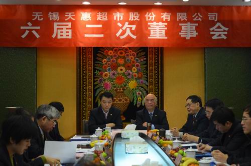 2013年12月14日上午,無錫天惠超市股份有限公司在集團公司三樓第二會議室召開了六屆二次董事會會議,董事會成員:張海良、張慶卿、楊興德、華泉榮、錢韌、邵裕妹、朱健祥、張恒、羅志堅、楊小虹、陳曉出席了會議。監事會組成人員列席了會議。會議由董事長張慶卿先生主持。