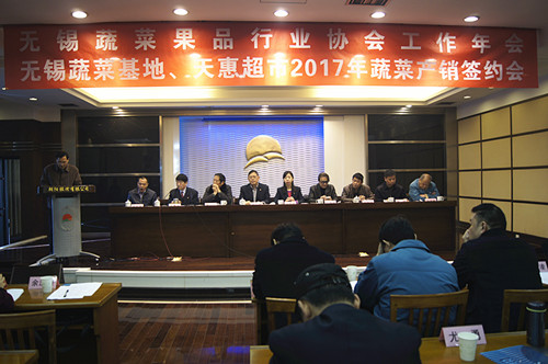 無錫蔬菜果品行業協會2016年工作年會、無錫蔬菜基地、無錫天惠超市股份有限公司2017年蔬菜產銷簽約會于12月7日上午,在朝陽股份農產品市場二樓會議室隆重召開。蔬果行業協會會員、基地菜農、朝陽股份和天惠超市主要領導200余人出席了會議。