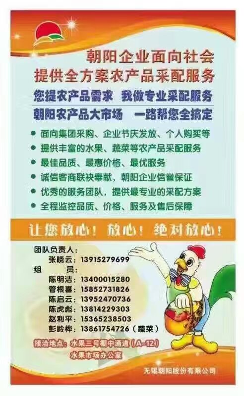 團隊負責人:張曉云:139 1527 9699 組 員:陳明潔:134 0001 5280 管根喜:158 5273 1826 陳啟云:139 5247 0736 陳虎彪:138 1422 9303 趙利平:153 6523 8503 彭嶺樺:138 6175 4726(蔬菜) 接洽地點: 水果三號棚中通道(A-12) 水果市場辦公室 (呂雪芳 報道) |