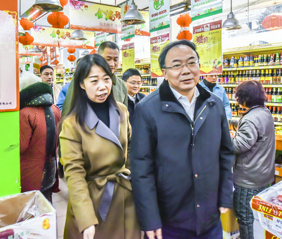 1月24日(臘月廿七)上午,無錫市委書記李小敏帶領(lǐng)市政府有關(guān)部門負(fù)責(zé)人一行,來到朝陽曹張農(nóng)貿(mào)市場和天惠超市曹張店,視察節(jié)前供應(yīng)工作。市委副書記、梁溪區(qū)區(qū)委書記徐劼,梁溪區(qū)區(qū)長秦詠薪陪同視察。無錫朝陽集團(tuán)董事長張君君、總經(jīng)理?xiàng)钆d德、副總經(jīng)理張慶卿接待領(lǐng)導(dǎo)視察團(tuán)一行。 上午九時(shí)許,李書記一行走進(jìn)朝陽曹張農(nóng)貿(mào)市場,實(shí)地視察了市場一樓的各個(gè)交易區(qū),聽取了張董事長有關(guān)曹張農(nóng)貿(mào)市場改造情況和節(jié)前農(nóng)產(chǎn)品市場供應(yīng)情況的匯報(bào),對(duì)曹張市場改造后整潔的環(huán)境面貌和有序的交易秩序表示了充分肯定。 視察中,李書記還在蔬菜攤位前停留,與經(jīng)營戶和消費(fèi)者親切交談,仔細(xì)詢問經(jīng)營戶的經(jīng)營情況和消費(fèi)者采購年貨情況,以及對(duì)市場改造的滿意度和意見建議。大家都表示市場改造后硬件環(huán)境大幅度改善,政府和企業(yè)切實(shí)為經(jīng)營戶和周邊的老百姓做了一件大實(shí)事,讓大家的菜籃子拎得更輕松。