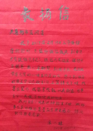 表揚信 天惠超市五河店: 我于2017年2月19日上午在你店購物時,不慎將錢包丟失,到中午才發(fā)現(xiàn)錢包不見了,錢包內(nèi)有現(xiàn)金(數(shù)千元)、銀行卡、票據(jù)等。我心急如焚,到處尋找,最后我?guī)е鵁o望的心情去你店詢問,想不到你店的黃美華同志撿到錢包后正等待失主呢。我喜出望外,想拿些錢以表謝意,可黃美華一再婉言謝絕我的好意。 我對黃美華同志這種拾金不昧、做好事不求回報的高貴品質(zhì)深受感動,特此致信深表感謝! 失主:朱二妹 2017年2月20日