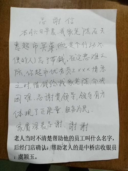 | 3月8號上午,超市的員工都正在忙碌著,一位老太太很感慨地拉住了我,說道:“經理,謝謝你們,你一定要幫我表揚你們的收銀員啊”,原來是我們的一位收銀員虞穎玉在收銀過程中幫助了她的老伴。 阿姨跟我娓娓道來事情的原由,她的老伴是一位腦梗初逾的老人,家人為讓他每天有所鍛煉,平時也讓他買買東西,這天他在超市買好菜就去結款,但結款的時候突然發現錢沒有帶,老人一下不知所措,非常焦急,我們的收銀員虞穎玉當時看他行動不便,就立即告訴了保安,并自己借錢給了這位老人解決了問題,雖然這件事情看似小事,確體現了我們員工身上的正能量,讓老太太一家都非常的感動,她寫了一張樸實的感謝信,讓我一定要表揚這位員工。 相信,我們只要真心地對待每一位消費者,真誠地為他們解決一些力所能及的問題,我們的服務一定會贏得消費者的認可,在提升我們客流量,銷售額的同時,更好地樹立我們企業在消費者心目中的良好形象。