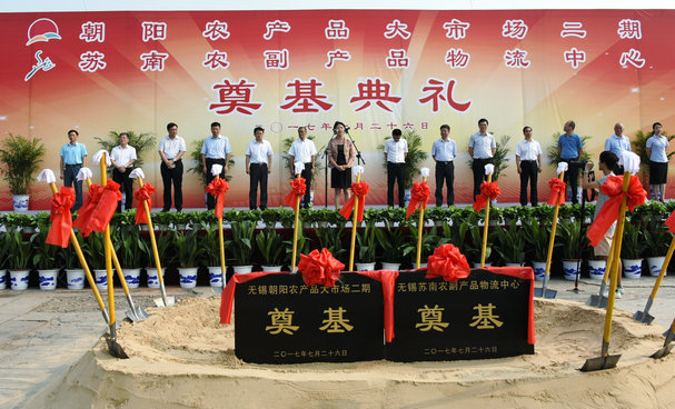 2017年7月26日上午,無錫朝陽農產品大市場二期暨蘇南農副產品物流中心奠基典禮在錫澄路280號工地現場隆重舉行。項目建設得到了無錫市委、市人大、市政府、市政協和市級各部門的高度重視,得到了區委、區政府和各級部門的大力支持。 出席慶典的主要領導有:無錫市副市長劉霞,梁溪區區長秦詠薪,產業集團董事局主席、黨委書記蔣國雄,市政府副秘書長糜君初、張千山,梁溪區人大主任鄒士輝,梁溪區政協主席陳錫明,市供銷合作總社理事會主任吳滿良,市糧食局副局長馬駿,梁溪區副區長朱剛,產業集團副總裁、蘇南物流公司董事長張曉耕,朝陽集團創始人張海良,天鵬集團董事長、總經理馬南生,朝陽集團董事長、蘇南物流公司總經理張君君等。 市級、區級有關部門領導,公安、消防、交警、城管、黃巷街道和莊前社區等領導也參加了奠基典禮。
