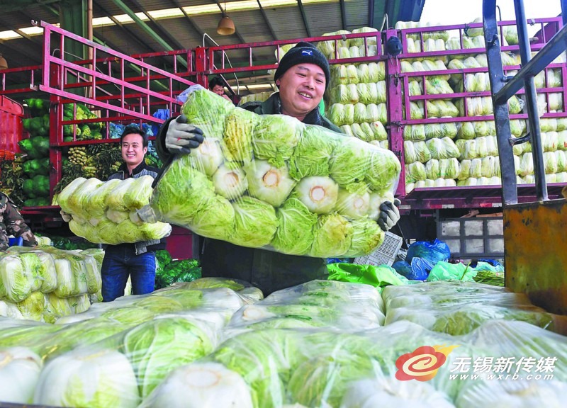 昨天,朝陽蔬菜批發市場員工將儲備菜搬運入庫。持續低溫且春節臨近,該批發市場積極履行企業社會責任,每天儲備1000噸左右的白菜、蘿卜等相關蔬菜,以彌補因低溫而導致的地產蔬菜供應缺口,讓市民安心過節。 (劉芳輝 攝) 來源:無錫日報 2018年2月8日 03版