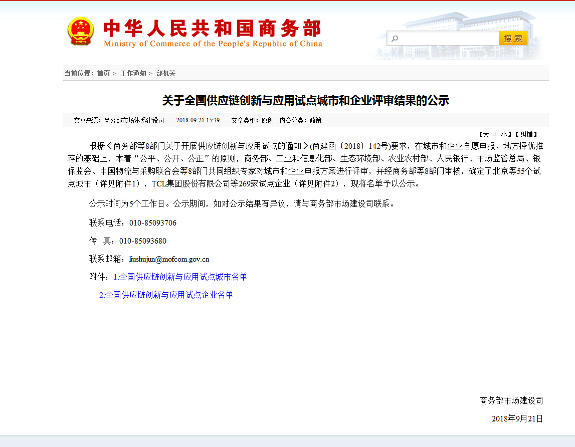 9月21日,國家商務部網站公布了《關于全國供應鏈創新與應用試點城市和企業評審結果的公示》。根據《商務部等8部門關于開展供應鏈創新與應用試點的通知》(商建函〔2018〕142號)要求,在城市和企業自愿申報、地方擇優推薦的基礎上,本著“公平、公開、公正”的原則,商務部、工業和信息化部、生態環境部、農業農村部、人民銀行、市場監管總局、銀保監會、中國物流與采購聯合會等8部門共同組織專家對城市和企業申報方案進行評審,并經商務部等8部門審核,確定了北京等55個試點城市,TCL集團股份有限公司等269家試點企業。 其中,江蘇無錫朝陽集團股份有限公司成功入選試點企業。