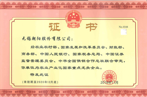 經(jīng)農(nóng)業(yè)農(nóng)村部、國家發(fā)展和改革委員會、財(cái)務(wù)部、商務(wù)部、中國人民銀行、國家稅務(wù)總局、中國證券監(jiān)督管理委員會、中華全國供銷合作總社聯(lián)合審定,無錫朝陽股份有限公司為農(nóng)業(yè)產(chǎn)業(yè)化國家重點(diǎn)龍頭企業(yè)。(有效期至2020年12月底)