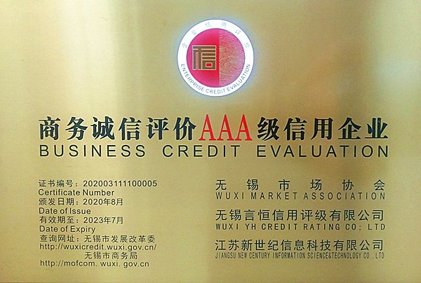 無錫朝陽股份有限公司被評(píng)為"商務(wù)誠信評(píng)價(jià)AAA級(jí)信用企業(yè)"