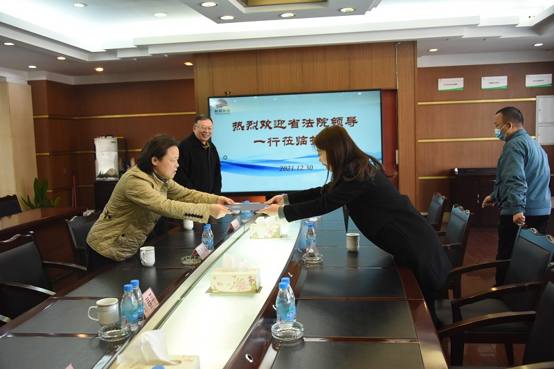 | 12月30日上午,省法院黨組成員、副院長(zhǎng)蔣惠琴帶隊(duì),省法院審監(jiān)庭庭長(zhǎng)張婷婷,省法院辦公室聯(lián)絡(luò)辦副主任耿春平等相關(guān)部門(mén)負(fù)責(zé)同志一行來(lái)到朝陽(yáng)集團(tuán),專(zhuān)程走訪省人大代表、省法院特約監(jiān)督員、朝陽(yáng)集團(tuán)董事長(zhǎng)張君君。市法院黨組副書(shū)記、副院長(zhǎng)李勇忠等領(lǐng)導(dǎo)陪同走訪。集團(tuán)總經(jīng)理?xiàng)钆d德陪同接待。 走訪中,蔣惠琴代表省法院黨組對(duì)張董長(zhǎng)期以來(lái)關(guān)心支持法院工作表示感謝,并向張董通報(bào)了2021年全省法院工作情況,認(rèn)真聽(tīng)取張董對(duì)法院工作的意見(jiàn)和建議。張董表示,省法院黨組高度重視人大代表聯(lián)絡(luò)工作,兩級(jí)法院領(lǐng)導(dǎo)親自上門(mén)走訪通報(bào)工作、征求意見(jiàn)建議,工作實(shí)在、作風(fēng)務(wù)實(shí),將繼續(xù)深化與省法院的溝通聯(lián)絡(luò),一如既往地對(duì)全省法院工作給予支持和關(guān)注,共同為推進(jìn) “強(qiáng)富美高”新江蘇現(xiàn)代化建設(shè)營(yíng)造良好法治環(huán)境。