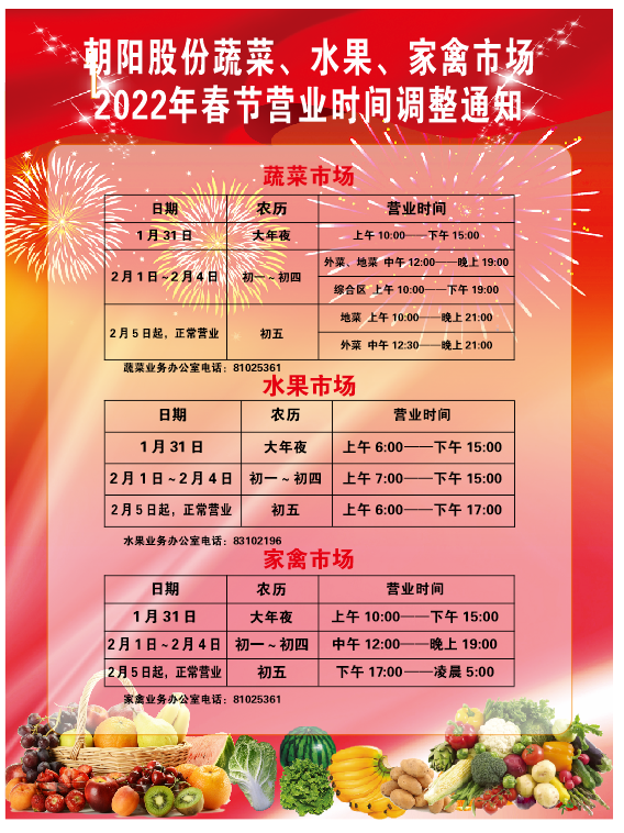 2月5日(初五)起,正常營業(yè) 上午6:00——下午17:00 水果業(yè)務(wù)辦公室電話:83102196 家禽市場營業(yè)時間: 1月31日(大年夜) 上午10:00——下午15:00 2月1日(初一)~2月4日(初四) 中午12:00——晚上19:00