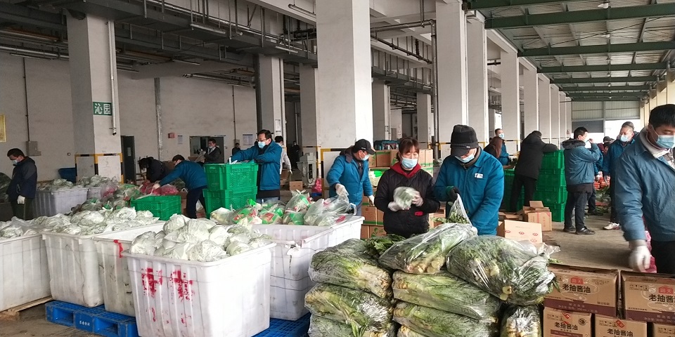 各種生鮮及生活物資被分配到朝陽冷庫月臺各個點后,除門崗防疫人員外,北區干部職工全員參加打包配送。從開始的750份的打包,到現在的2950份;從北區員工到朝陽集團各單位一齊干。