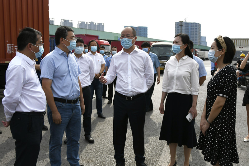 朱書(shū)記先后來(lái)到朝陽(yáng)陳列館、信息中心、水果市場(chǎng)、中停車場(chǎng),認(rèn)真聽(tīng)取了朝陽(yáng)農(nóng)產(chǎn)品大市場(chǎng)在疫情防控、貨源組織、保障供應(yīng)等方面的具體舉措,詳細(xì)詢問(wèn)了市場(chǎng)對(duì)人、車、物的管控情況,市場(chǎng)人員的核酸采樣情況及中高風(fēng)險(xiǎn)地區(qū)來(lái)錫人員的應(yīng)急處置措施,朱總逐一進(jìn)行了匯報(bào)。