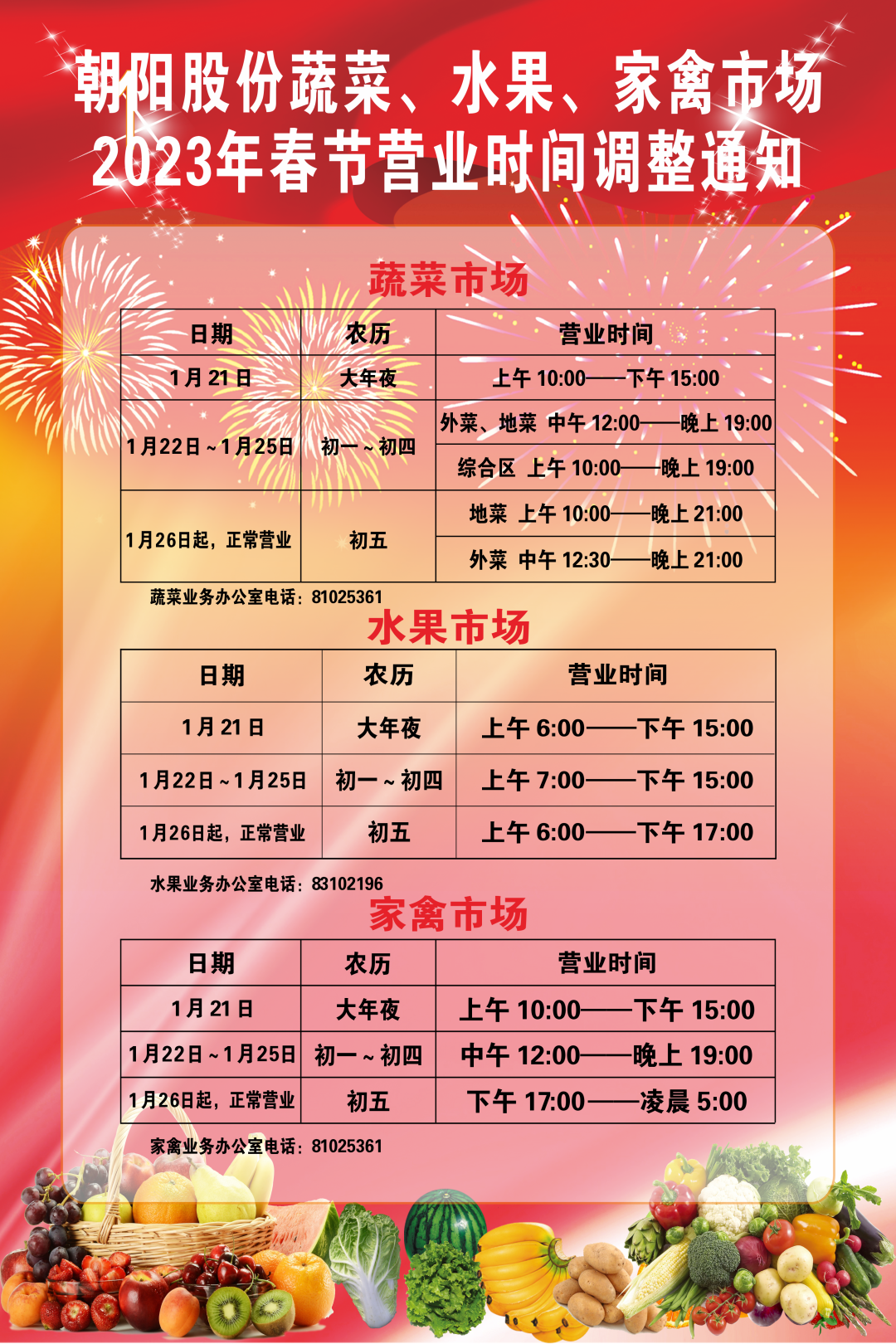 為確保春節(jié)期間市場供應,朝陽股份蔬菜、水果、家禽市場營業(yè)時間作如下調(diào)整: