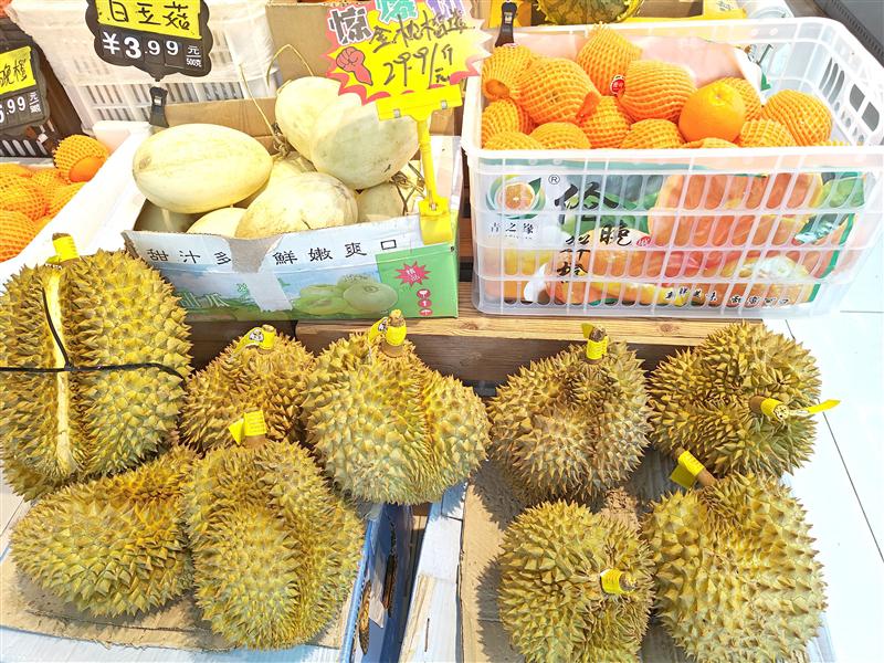 經開區萬科信成道的一家水果賣場,最靠里的一片被單獨開設為榴蓮專賣區,高低錯落的三層架子上鋪著綠色軟墊,十幾只榴蓮被零散擺放著,從門口剛進入就能聞到濃郁的榴蓮香氣。“最近榴蓮價格下來了很多,本來架子上都放滿了,周末兩天基本賣完了,只剩下沒熟和有瑕疵的果子?!痹摰甑陠T說,店里的金枕榴蓮從3月份的45元/斤左右,降到了39.9元/斤,周末特賣只要29.9元/斤,之前一直觀望的顧客都來下手了,“現在買一個5斤重的榴蓮,要比以前省好幾十元!”