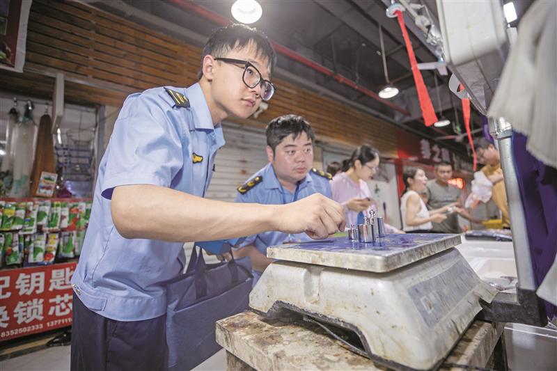 8月是海鮮大量上市的季節,為規范市場經營行為,凈化市場環境,昨天上午,無錫經開區市場監督管理局啟動了海鮮市場短斤缺兩等消費欺詐行為專項整治行動。圖為執法人員在周新農貿市場海鮮攤位檢查電子秤。(宗曉東 攝)