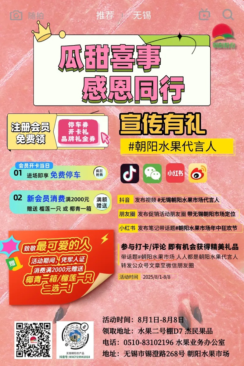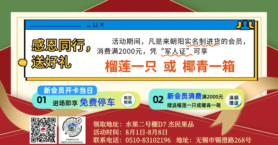 瓜甜喜事,感恩同行,朝陽(yáng)與您共慶榮光! 當(dāng)甜蜜遇上擔(dān)當(dāng),致敬永不褪色。 在這個(gè)禮贊奉獻(xiàn)的時(shí)刻,無錫朝陽(yáng)農(nóng)產(chǎn)品大市場(chǎng)也為大家準(zhǔn)備了一場(chǎng)“清涼盛宴” 這個(gè)夏天,就讓我們用最應(yīng)季的甜蜜,向這群“最可愛的人”道一聲:辛苦了! 讓清甜多汁的水果,新鮮健康的蔬菜,為這個(gè)夏天降溫,更向守護(hù)我們的最可愛的人傳遞一份暖心敬意。 活動(dòng)期間,凡是來朝陽(yáng)實(shí)名制拿貨的會(huì)員,消費(fèi)滿2000元,憑“軍人證”可享:榴蓮一只或椰青一箱。