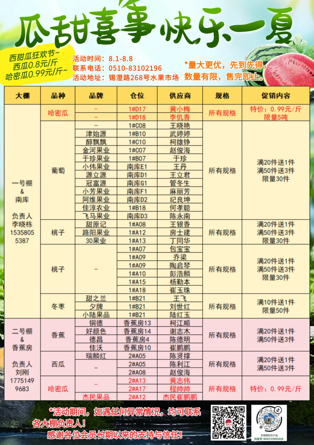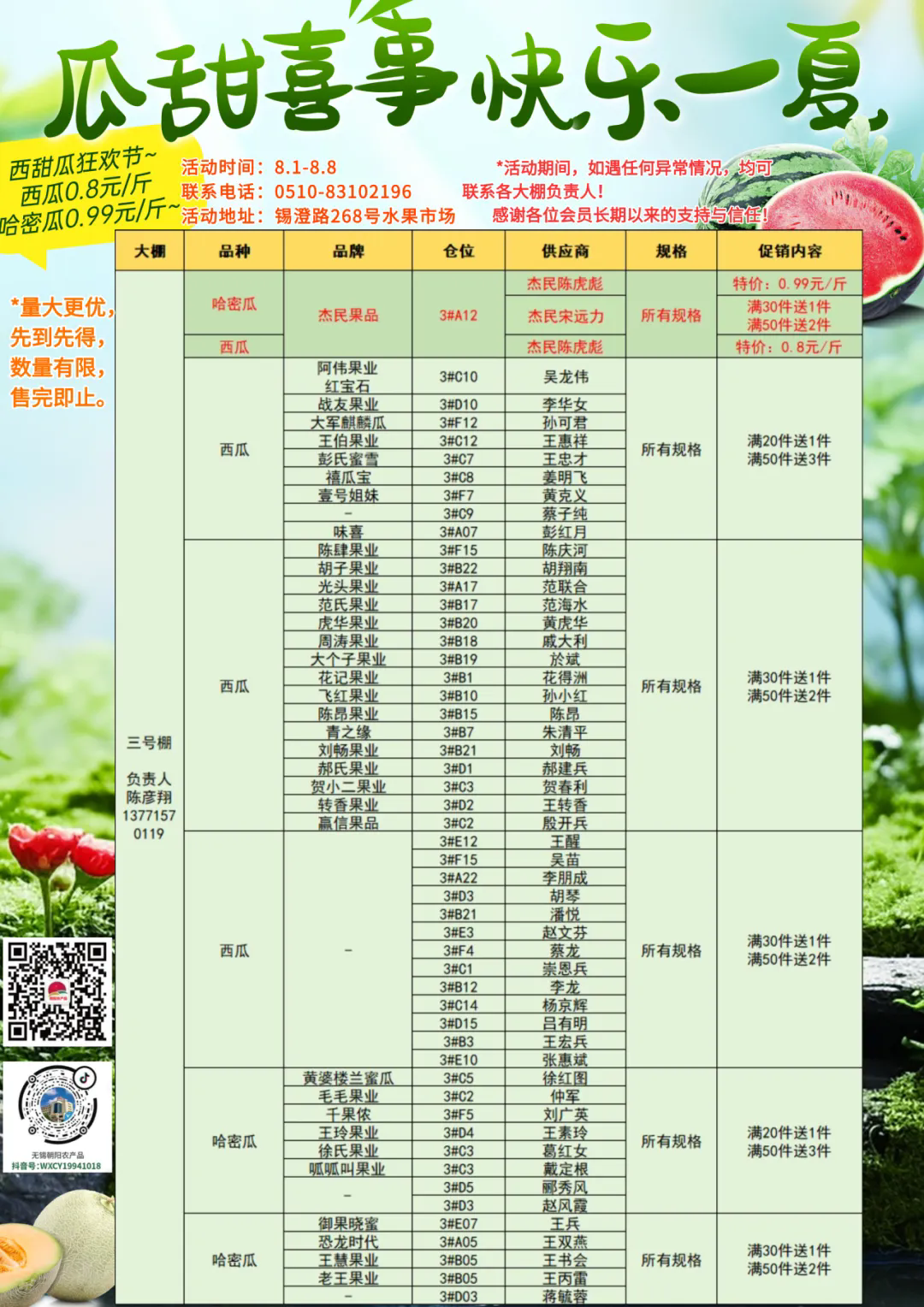 活動(dòng)時(shí)間:8月1日-8月8日 市場(chǎng)地址:無錫市錫澄路268號(hào) 這個(gè)夏天,讓清甜的西瓜,甜瓜驅(qū)散炎熱,讓一份份暖心的敬意傳遞溫情。 無論是為家人準(zhǔn)備夏日解暑果,還是為致敬獻(xiàn)上一份心意,我們都在無錫朝陽(yáng)農(nóng)產(chǎn)品大市場(chǎng)等您! 一起用甜蜜致敬擔(dān)當(dāng),讓這個(gè)夏天,充滿清涼與感動(dòng)!