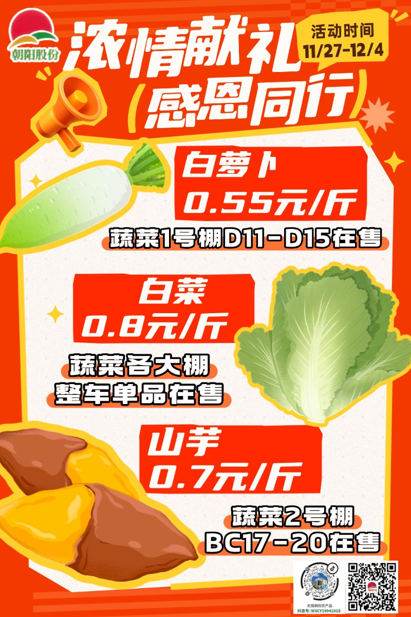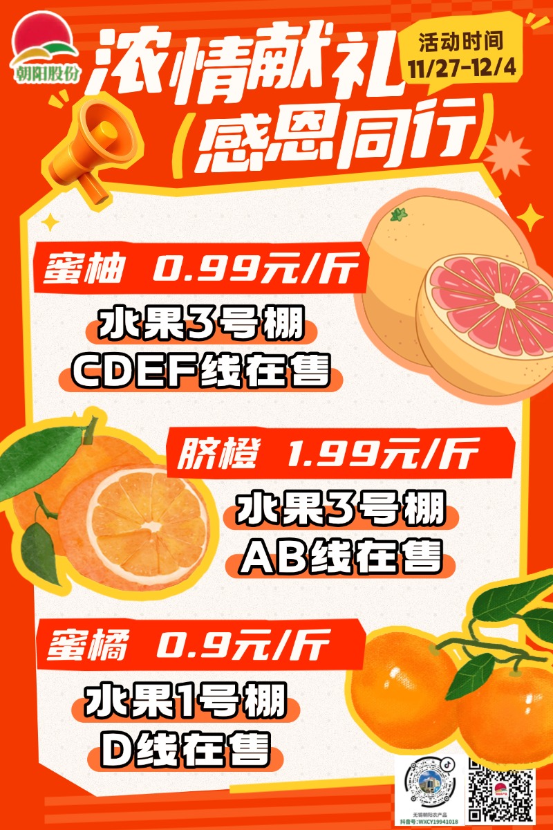 值此感恩節(jié)之際,朝陽農(nóng)產(chǎn)品大市場心懷感恩,向每一位消費(fèi)者致以誠摯謝意!為回饋一路以來的支持與厚愛,11 月 27 日 - 12 月 4 日,鮮果蔬菜爆品促銷盛典溫情上線!依托產(chǎn)地直供優(yōu)勢與成熟供應(yīng)鏈,以暖心低價(jià)、新鮮品質(zhì),向廣大消費(fèi)者獻(xiàn)禮,讓感恩與美味相伴同行! 在售區(qū)域:水果1號棚BC線