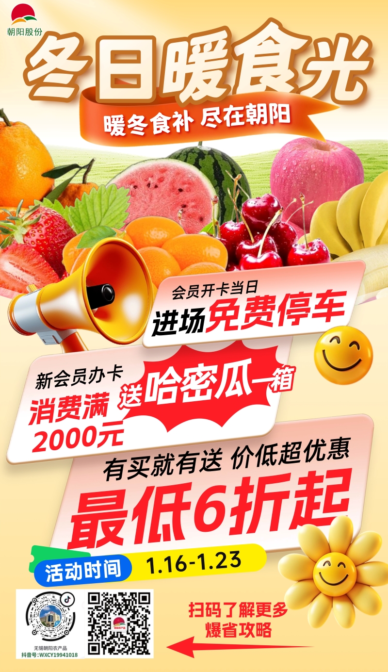 寒風凜冽,暖食暖心!當冬日的煙火氣遇上實打實的采購福利,幸福感直接拉滿!朝陽農產品大市場冬日暖食光蔬果促銷活動溫情啟幕,116-123日,精選當季優質蔬果,全場促銷價均低于行情價,勁爆讓利不停歇,為你承包整個冬日的新鮮與實惠!