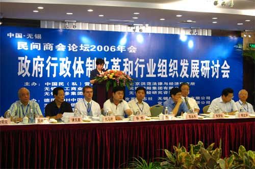由中國(guó)民(私)經(jīng)濟(jì)研究會(huì)、北京洪范法律與經(jīng)濟(jì)研究所、無(wú)錫市工商業(yè)聯(lián)合會(huì)、無(wú)錫朝陽(yáng)集團(tuán)有限公司、無(wú)錫益多集團(tuán)有限公司、無(wú)錫比較研究咨詢事務(wù)所主辦,德國(guó)ZDH中國(guó)辦公室、中國(guó)改革雜志社等單位協(xié)辦的“民間商會(huì)論壇2006年會(huì)-政府行政體制改革和行業(yè)組織研討會(huì)”,于2006年8月11日~13日在無(wú)錫國(guó)際飯店舉行。